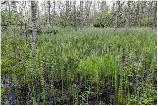 Ein Wald voller Schachtelhalm und eine Wiese voll mit Bach-Nelkwurz.